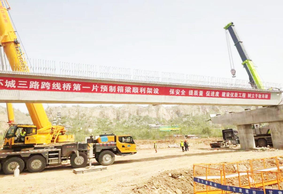 臨夏市環(huán)城北路建設(shè)工程環(huán)西三路跨線橋第一片箱梁吊裝完成