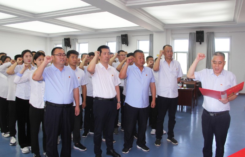 6月30日上午,慶?;顒釉诩ぐ旱膰杪曋欣_了序幕,全體參會人員肅立,以飽滿的精神狀態(tài)齊唱國歌?!拔抑驹讣尤胫袊伯a(chǎn)黨,擁護黨的綱領,遵守黨的章程,履行黨員義務......”全體黨員列隊,面對鮮艷的黨旗,由新能源公司黨支部書記、董事長馬有勝同志領誓,重溫入黨誓詞。錚錚誓言代表了每一位黨員忠誠奉獻、嚴于律己。
