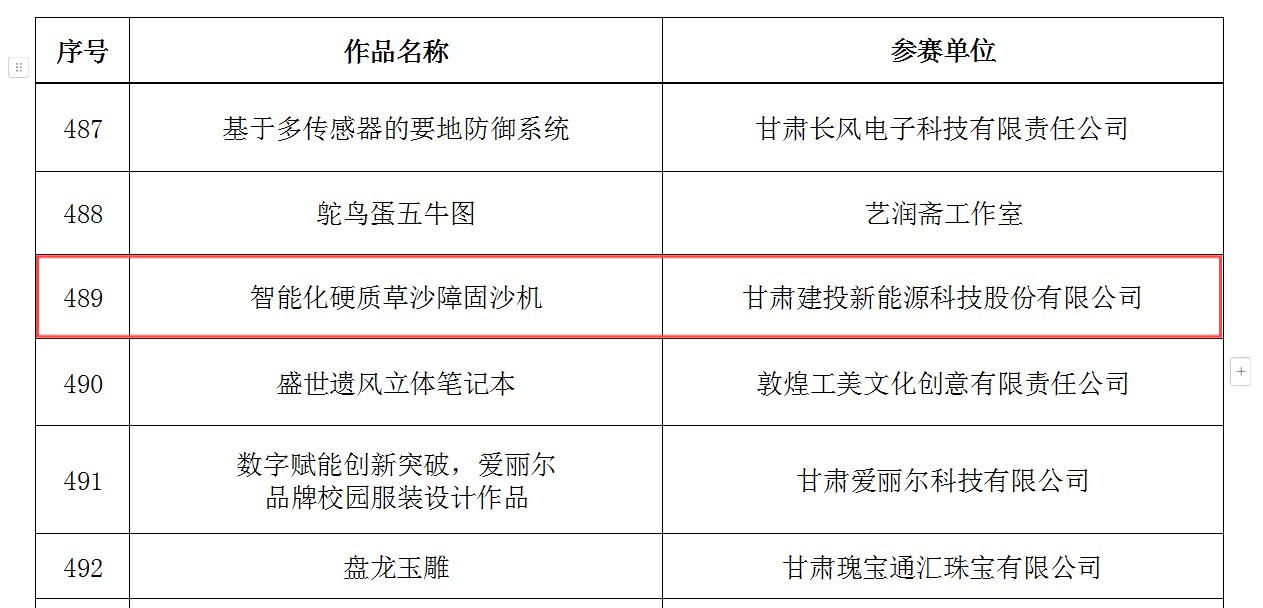 近日,《甘肅省第五屆“創(chuàng)新杯”工業(yè)設(shè)計(jì)大賽產(chǎn)品組復(fù)評(píng)入圍名單》于甘肅省“創(chuàng)新杯”工業(yè)設(shè)計(jì)大賽官網(wǎng)發(fā)布,共528件產(chǎn)品進(jìn)入復(fù)評(píng)名單,甘肅建投新能源科技股份有限公司設(shè)計(jì)開(kāi)發(fā)的工業(yè)新產(chǎn)品“智能化硬質(zhì)草沙障固沙機(jī)”榜上有名。