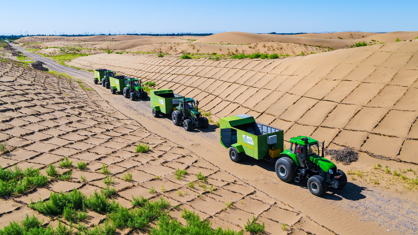 在浩瀚無垠的騰格里沙漠,新能源公司自主研制的治沙車,成為改變生態(tài)命運的“綠色先鋒”。LGSV-200多功能立體固沙機、GSDQ750-132L單向牽引式半隱蔽型草沙障固沙機等一系列國際領(lǐng)先機械治沙裝備,在沙漠中縱橫馳騁,高效完成草方格鋪設(shè)、植被種植等艱巨任務(wù)。它們配備的智能控制系統(tǒng),可依據(jù)不同的沙漠地形與土壤條件,精準調(diào)整工作模式,工作效率遠超人工操作數(shù)倍。伴隨著治沙車的穿梭,原本肆虐的黃沙逐漸被綠色植被覆蓋,沙漠生態(tài)環(huán)境得到有效改善。新能源公司積極探索沙漠治理新模式,不斷拓展生態(tài)領(lǐng)域的多元化業(yè)務(wù),在騰格里沙漠南緣開展工程與生物治沙試驗示范與推廣,成功建立了全國荒漠化防治(機械治沙工程)試驗示范基地,承攬的千里沙漠大林帶機械固沙項目等一系列機械化防沙治沙工程,已累計完成一萬余畝沙漠綜合治理。2024年,公司高性能治沙機械產(chǎn)品GSDQ750-132L單向牽引式半隱蔽型草沙障固沙機入選《“三北”工程首批適用林草機械裝備》目錄。