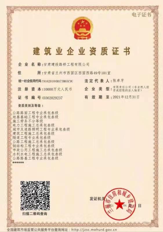 建筑業(yè)企業(yè)資質(zhì)證書(shū)(公路路面工程專(zhuān)業(yè)承包叁級(jí)、地基基礎(chǔ)工程專(zhuān)業(yè)承包叁級(jí)、施工勞務(wù)不分等級(jí)、電力工程施工總承包叁級(jí)、城市及道路照明工程專(zhuān)業(yè)承包叁級(jí)、建筑工程施工總承包叁級(jí)、隧道工程專(zhuān)業(yè)承包叁級(jí)、公路工程施工總承包叁級(jí)、鋼結(jié)構(gòu)工程專(zhuān)業(yè)承包叁級(jí)、市政公用工程施工總承包叁級(jí)、水利水電工程施工總承包叁級(jí)、公路路基工程專(zhuān)業(yè)承包叁級(jí)))
